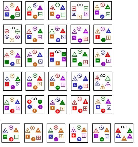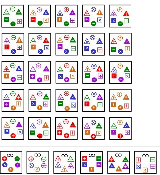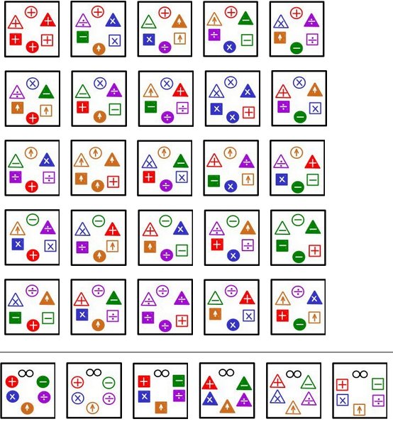 First, pull aside any 6 cards containing some common symbol. If this is your first time playing, the infinity (sideways 8) is the easiest symbol to use for this purpose, as the remaining sets will have convenient properties.
